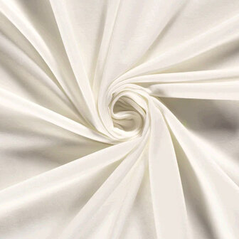 Stof: viscose tricot  Samenstelling: 68% bamboo, 28% katoen, 4% elastaan  Gewicht: 200g gram/m²  Breedte: 150 cm  Kleur: ecru    Wassen op 30 graden. ...